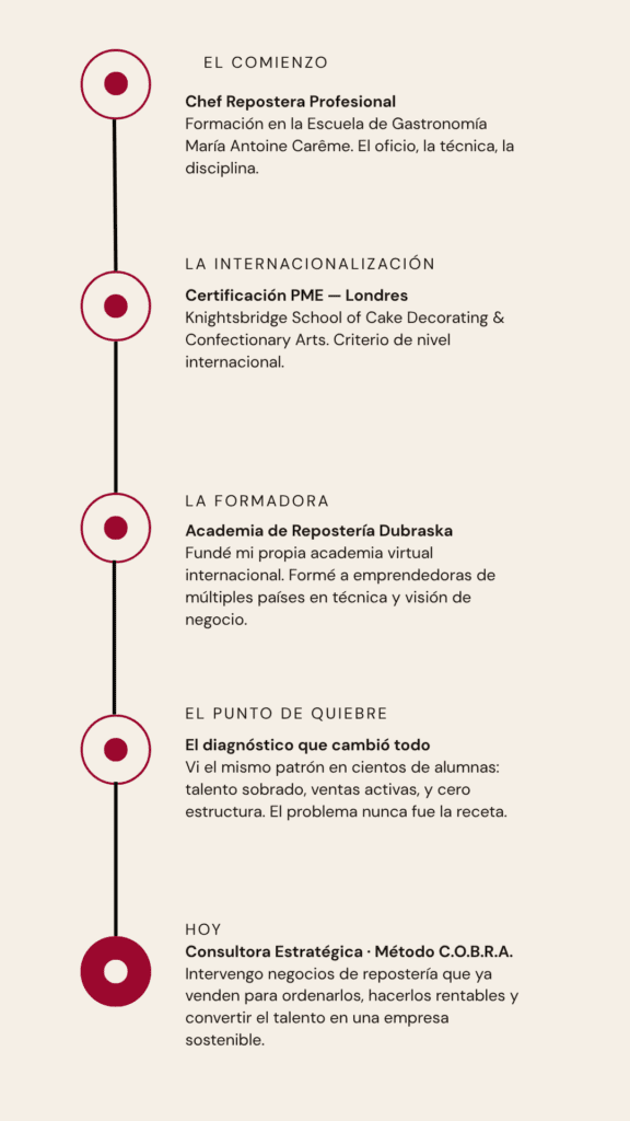 Eso fue lo que me llevó a dar el giro más importante de mi carrera. Dejé de enseñar técnica para empezar a intervenir negocios. Desarrollé el Método C.O.B.R.A. — una metodología propia de intervención empresarial diseñada específicamente para el sector gastronómico — y hoy trabajo con reposteras que ya venden para ayudarlas a construir lo que siempre debió existir detrás de su talento: una empresa real y rentable.